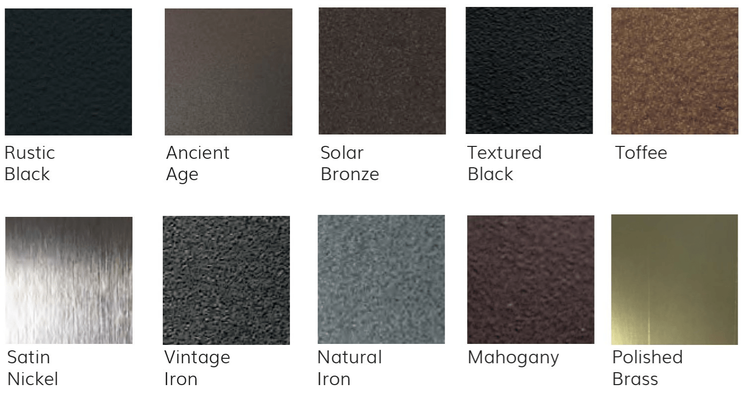 • Available in ten powder coat finishes: Ancient Age, Mahogany, Natural Iron, Polished Brass, Rustic Black, Satin Nickel, Solar Bronze, Textured Black, Toffee, and Vintage Iron